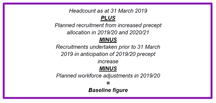At this stage, the force-by-force baseline for the uplift – the starting point against which increases will be assessed – is still being determined, according to a formula devised by the Home Office that starts from the police workforce statistics as at 31 March 2019 and then takes account of other recruitment and workforce plans that aren’t reliant on uplift funding (below).